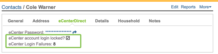 To unlock a specific client's account, go to their contact record, and on the eCenter Direct tab you will see the number of times the user tried to log into eCenter Direct unsuccessfully: