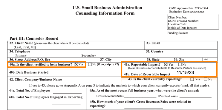 The SBA Nexus system measures business starts based upon the total number of clients with a Reportable Business Start Impact Date within the reporting period. The "Reportable Business Start Impact" field is a new field introduced on October 1, 2023 on the SBA 641 along with the "Verified to be in business" field: