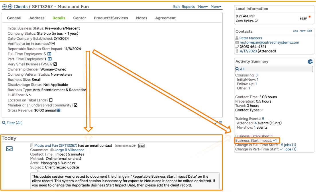 Administrators can edit this session, but they can only change the counselor selection, the center selection and the funding source. No other fields can be edited. To change or delete the Reportable Business Start Impact, the administrator can edit the client record and either update the Reportable Business Start Impact date or delete it. Editing the field on the client record automatically updates the Impact session.