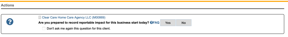 Again, if you click "Yes" to record reportable impact for the client, then today's date will be put in the Business Start Impact Date field, and a Business Start Impact milestone will be automatically created. If you don't want to claim reportable impact today, nor do you anticipate claiming reportable impact in the future, then you can check the: "Don't ask me again this question for this client" then no reportable business impact will be claimed and this question will never pop-up again. If you simply select "No" then the same question will be asked the next time you meet with a client. checkbox. If you don't want Neoserra to ask you this question again, then it will be your responsibility to remember to set the Reportable Business Start Impact if/when you have substantively provided assistance to the client. The setting only applies to your user login, other users in your network will still see the prompt unless they also check the "Don't ask me..." box.