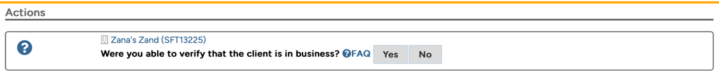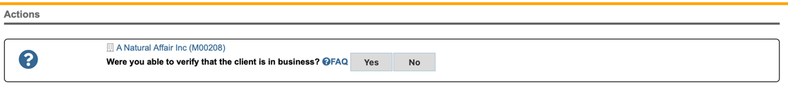 - If a client has a date established in their client record that is more than one year ago, and the "Verified to be in business" field is not checked, then Neoserra will offer the following prompt, after creating a session: