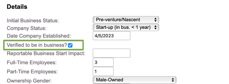 Once the counselor verifies that the client is in business based upon the criteria above, then the counselor will need to check the: "Verified to be in business?" checkbox on the client record: