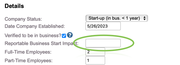 As soon as the client is verified to be in business by the business counselor then the "Reportable Business Start Impact" field becomes available for editing:
