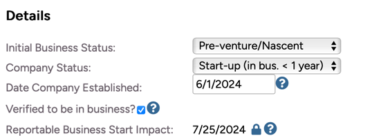 The bottom line, Neoserra will ONLY prompt to record Business Start Impact if the business formation was less than 1 year ago from the counseling session. Neoserra will continue to ask the counselor to verify that the client is in business regardless of when they started their business. Answering "Yes" to this question will check the "Verified to be in business" checkbox on the client record but no milestones will be created.