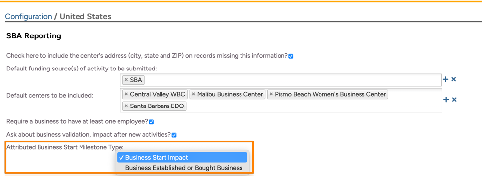You may elect to track attribution either on the Established Date of the company or the Reportable Business Start Impact Date as determined on the Administration|Configuration|United States SBA page: