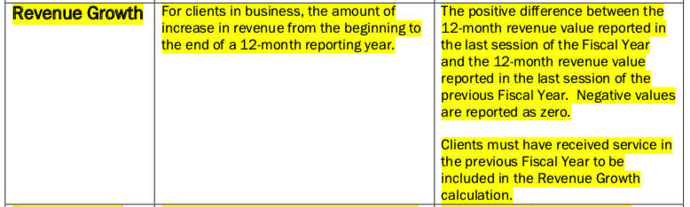 Neoserra will report the positive difference between the latest sales data in the current reporting period and the sales value reported in the prior period assuming the client had sales values in the prior period. As per the SBA OED Terms, Definitions and Calculations document, clients must have received service in the previous reporting period in order to be included in this calculation and only positive growth is recognized: