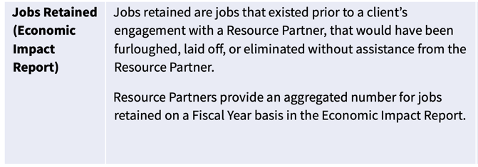 The Jobs Retained (EDMIS Definition) line item is also dependent upon the Neoserra job tracking table and thus can only reliably be run with reporting dates after September 30, 2018. The most important thing to realize is that this scorecard line item is calculated by Neoserra on the fly. It is not based upon milestones! In 2018, SBA defined all jobs that the client carries over from a prior period to the current period as jobs retained.