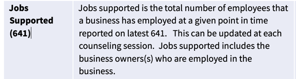 Total Jobs Supported is merely a count of all employees (full-time and/or part-time) on the client record for those clients that were served (i.e. counseled or trained) during the reporting period and whose business status is either in-business or pre-venture.