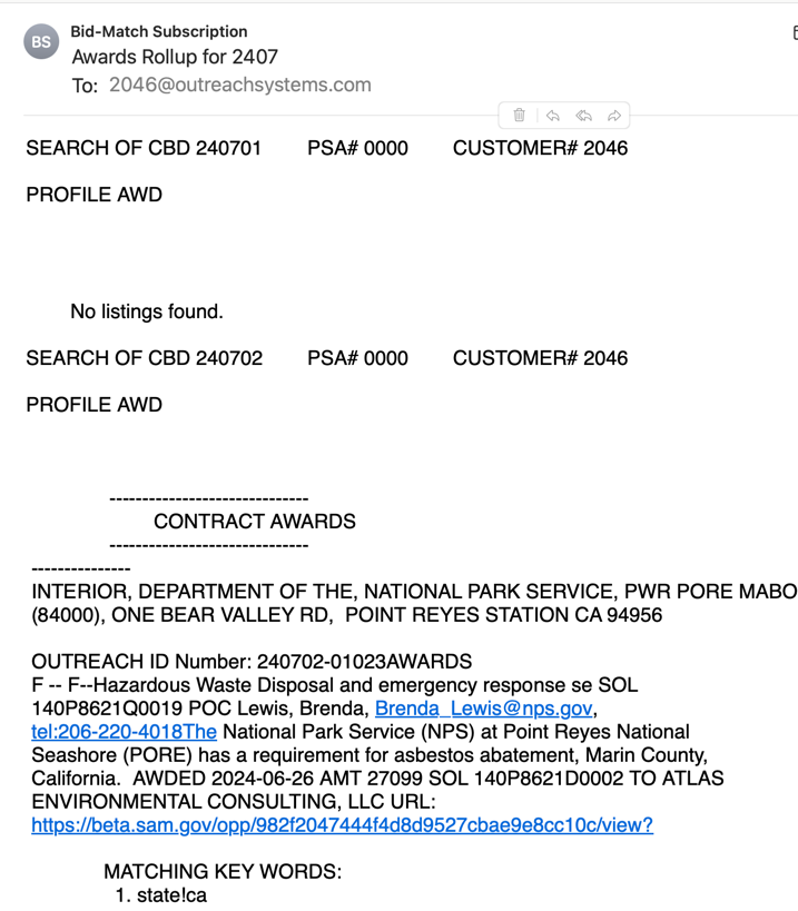 Unfortunately, the award notifications in SAM do not provide consistent information to allow us to import these records into your Neoserra database, however, this informational message can help you identify companies in your state that are receiving contract awards in a timely manner. Some of these companies may be clients of your program already, and some may not. OutreachSystems offers this monthly awards report to allow you to see what companies are successful with government contracting. In some cases, these companies may be prospective clients of your program.