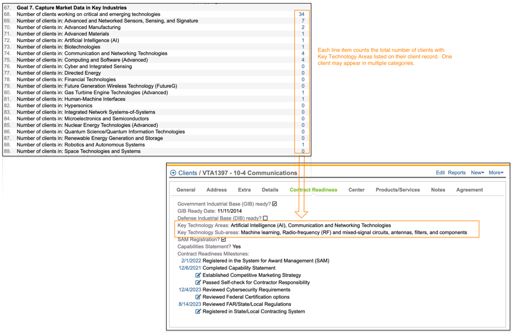 This section of the scorecard identifies those clients that are working on critical and emerging technologies. This line item counts all clients in the database that have indicated that they are working in one of the Key Technology Areas identified by DoD, and who have had counseling and/or training activity during the period.