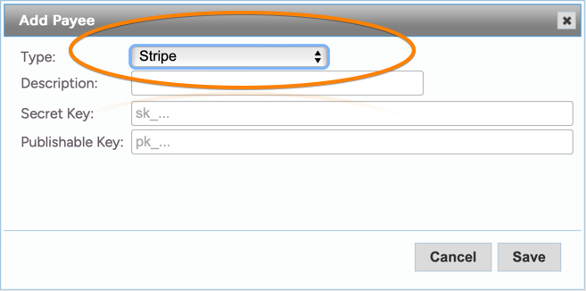 - At the "Add Payee" screen, select "Stripe" from the Type field.