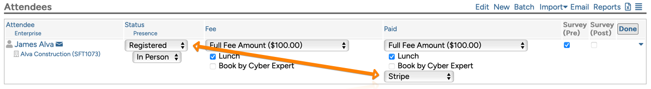 People who have registered, regardless of whether they have paid or not, will count towards the maximum number of attendees for the event. However, the person's registration won't be complete until payment has been made. The registrant will initially receive the 'Signup Notification (Payment Required)' email message. Once they submit their payment, they will receive a second registration confirmation email using the 'Signup Confirmation (Existing User)' template. While these templates can be customized, it is recommended that these templates are not disabled. Once the registrant pays, either online using Stripe, or by sending a check or providing cash their "Paid" status in the attendee list should be updated to reflect the amount they paid and the method of payment. As soon as this information is updated, it will not only trigger the email message referenced above, the registrant's status on eCenter Direct will also automatically change to "Registered:"