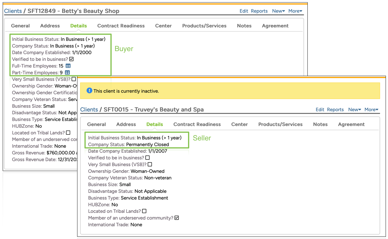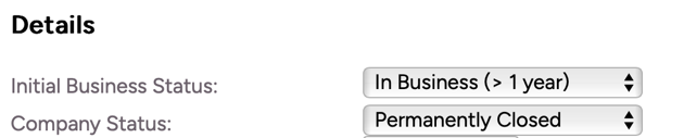 Again, if the purchased business was also a client in your database, then you will now inactivate this record and indicate in the Business Status field that the business is closed: