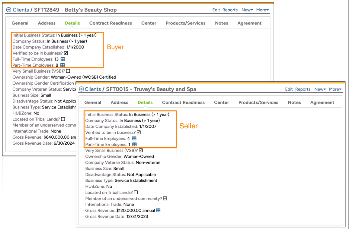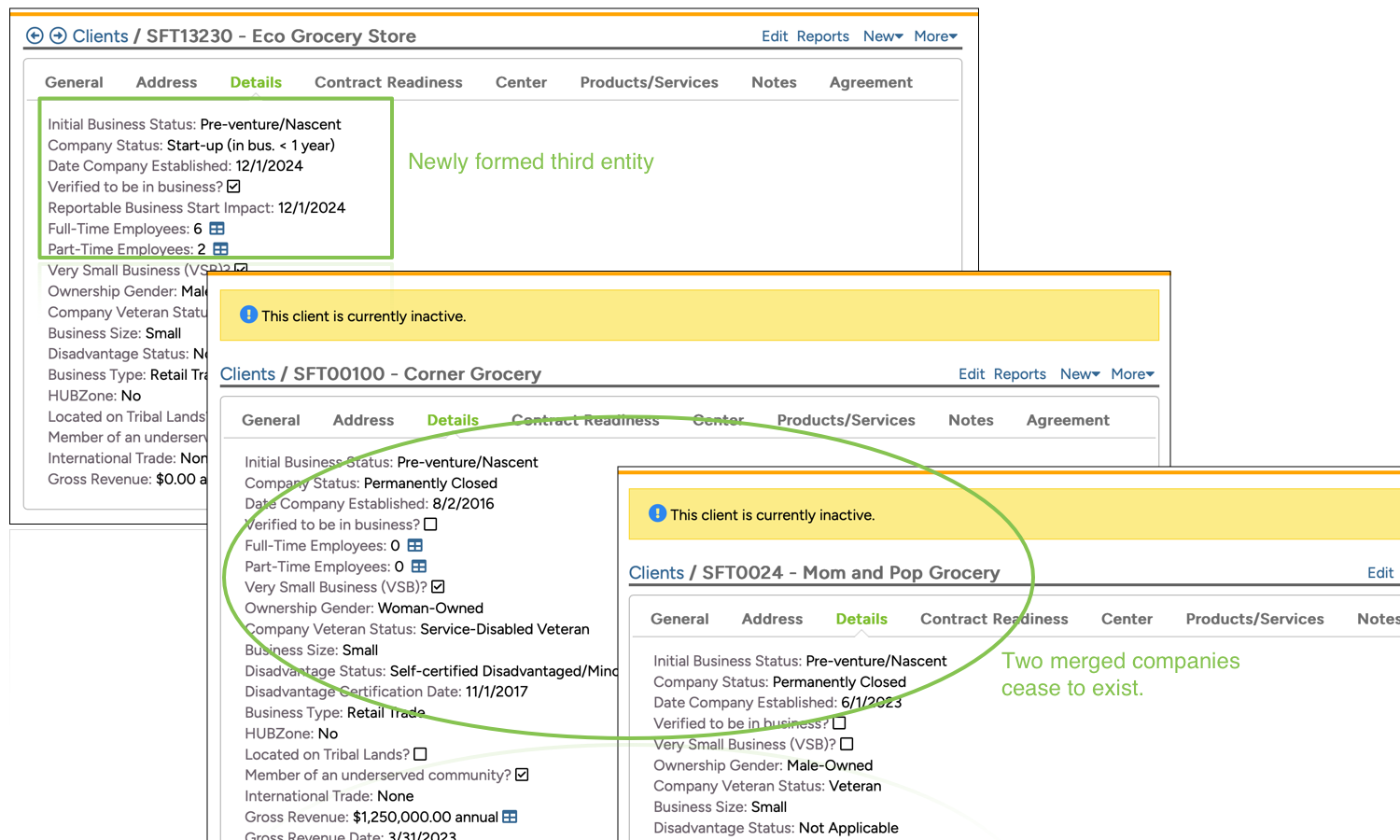 You will record your counseling, as appropriate, under the respective client record(s). Once the acquisition has been finalized, and the entrepreneur successfully takes over the existing business, then you will update the entrepreneur's client record, as appropriate, with the company name, employees, certifications, etc. Additionally, you will log your reportable business start impact date.