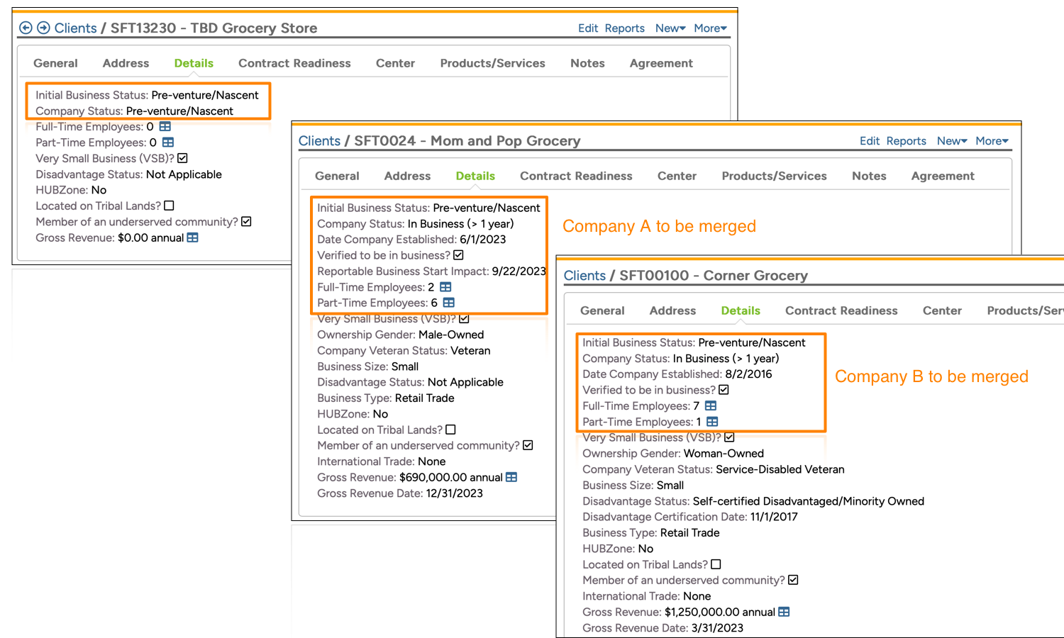 A less common scenario might be where company A and company B merge together to form company C. Mergers combine two separate businesses into a single new legal entity. True mergers are uncommon because it?s rare for two equal companies to mutually benefit from combining resources and staff to form a completely new business. However, if you encounter this scenario, then you will want to create a pre-venture record in Neoserra for the newly formed entity and record all of your counseling under this one record. You may, or may not, also have client records in the database for the two companies to be merged. However, in order to record the business start, a pre-venture record will be necessary, thus your database could have the following records: