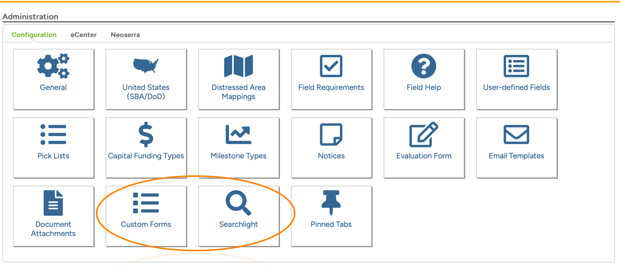 Under the Administration|Configuration you will see a "Searchlight" panel if you have purchased the Custom Forms module: