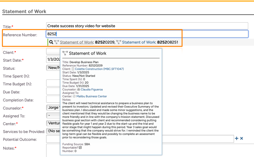 With the duplicate trigger in place, anytime a user creates a new custom form record, a duplicate warning will appear if there are any other records that match on the number of characters specified. In the example below, the first four characters entered in the reference number field matches two other records. You can hover over the records to see the specific details and make a determination if they are the same: