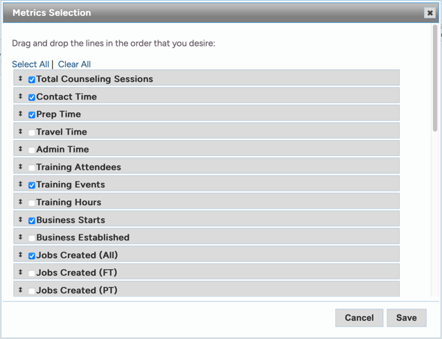 | Business Starts | A count of all active or inactive clients where the Reportable Business Start Impact date on the client record falls within the cross tab reporting period. This metric does not take into account whether the client was counseled during the period, or not |
