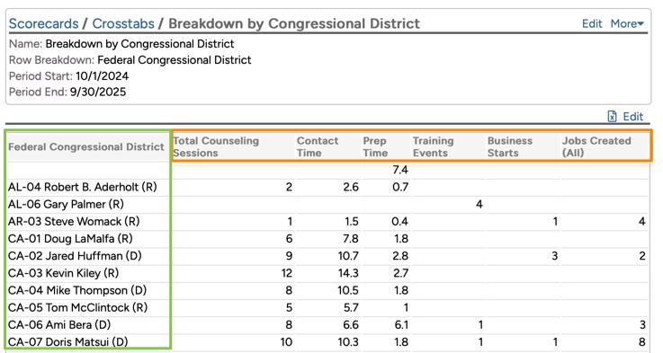 You will notice the metrics across the banner left to right, and the rows include all the data found in the database. If a congressional district or county it missing, then that means that no metrics were found in that particular district/county/etc. At the top of the screen you can edit the parameters and change the date and/or centers to be included in your crosstab.