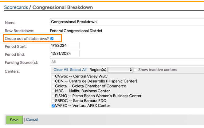 To edit the date range or centers, you can click to edit the parameters on top of the page. By default, the crosstabs will always be generated for your current fiscal year for all centers to which you have permissions and all funding sources. You can change the parameters as appropriate, and if your breakdown is by one of the geographic options (State, County, Federal Congressional District, State Representative District or State Senate District), then you can also check the "Group out of state rows?" which will take all activity in areas out of your state and lump them together in one "Out of State" line.