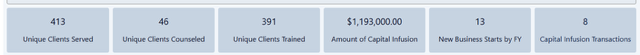 The "Unique Clients Counseled" line item does not take training attendance into consideration and only looks to see if a client has been counseled during the period, or whether they received capital funding. Again, a client counseled multiple times is still only counted as one unique client.