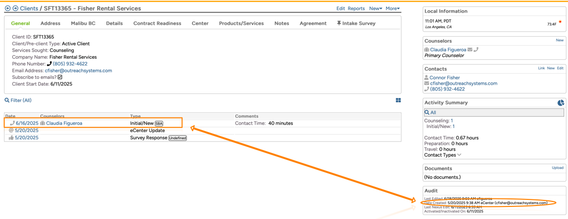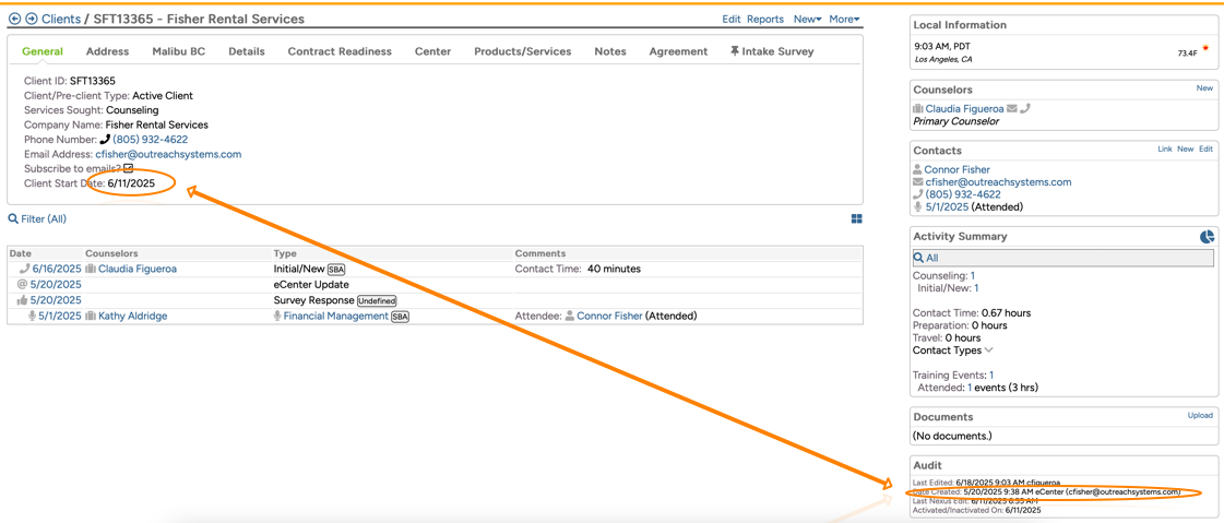 This metric is designed to track the average number of days between a client signing up on eCenter Direct and being accepted into the system as a client record. It should be noted, that the metric also includes clients that were manually entered into Neoserra. The metric specifically looks at the "Date Created" in the Audit panel, and measures the total number of days until the client "Start Date" on the client record: