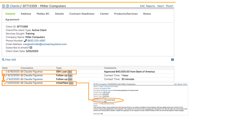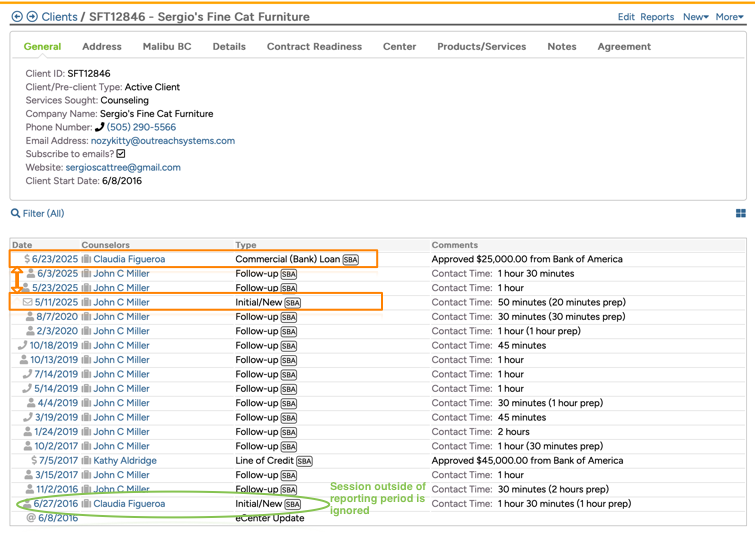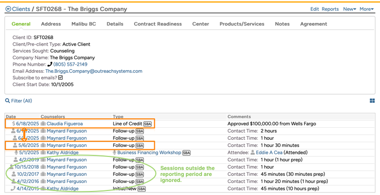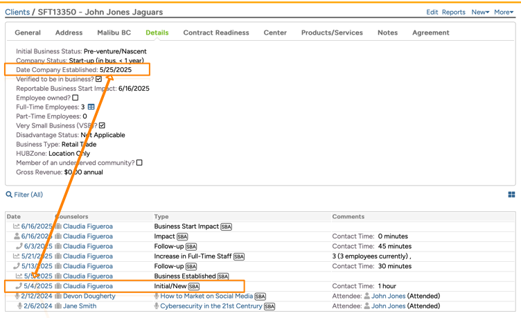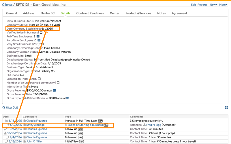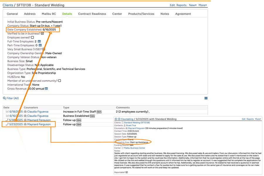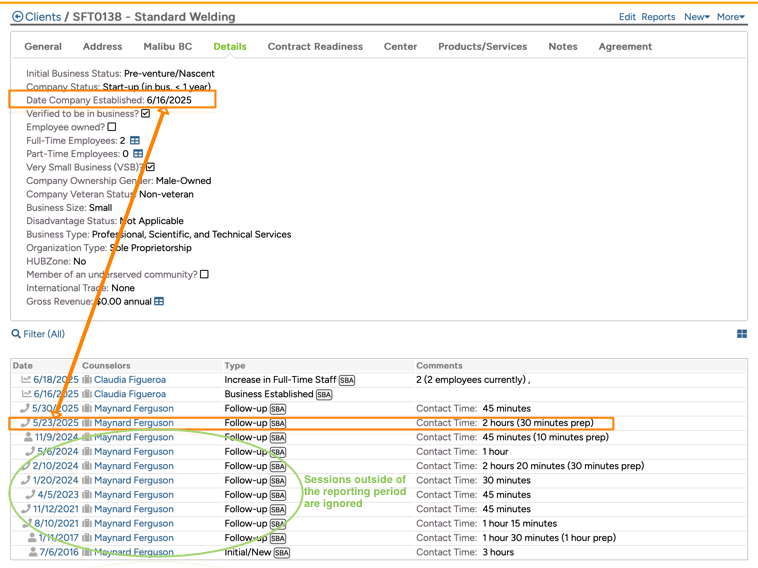 This metric is designed to track the average number of days between a client's first counseling session in the reporting period where the Counseling Area is set to "Start-up Assistance" and the client's Date Company Established. It should be noted, that a client may have multiple sessions related to start-up assistance during the reporting period, but Neoserra will use the date of the first counseling session in the reporting period. Also, it is important to note that sessions that took place outside of the reporting period are not taken into consideration. The metric specifically looks at the "Session Date" on the counseling session record and the Date Company Established on the client record: