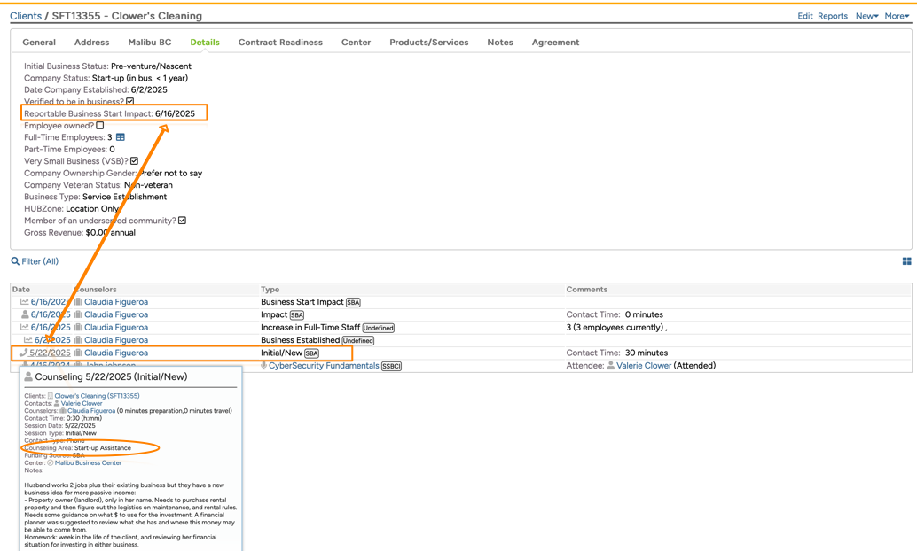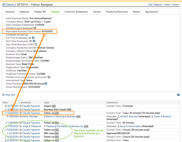 This metric is designed to track the average number of days between a client's first counseling session in the reporting period and the client's Reportable Business Start Impact Date It should be noted, that a client may have had counseling sessions prior to the reporting period, but Neoserra will use the date of the first counseling session in the scorecard definition period. Sessions that took place outside of the reporting period are not taken into consideration. The metric specifically looks at the "Session Date" on the counseling session record and the "Reportable Business Start Impact Date" on the client record: