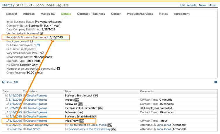 This metric is designed to track the average number of days between a client's first counseling session in the reporting period where the Counseling Area is set to "Start-up Assistance" and the client's Reportable Business Start Impact Date. It should be noted, that a client may have multiple sessions related to start-up assistance during the reporting period, but Neoserra will use the date of the first counseling session in the reporting period. Also, it is important to note that sessions that took place outside of the reporting period are not taken into consideration. The metric specifically looks at the "Session Date" on the counseling session record and the Reportable Business Start Impact Date on the client record: