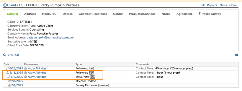 Date interval tracking measures the average time between one event and another event. For example, it can measure the average time between the start date of a client and their first counseling session. Or the average time between their first initial counseling session and their first follow-up counseling session.