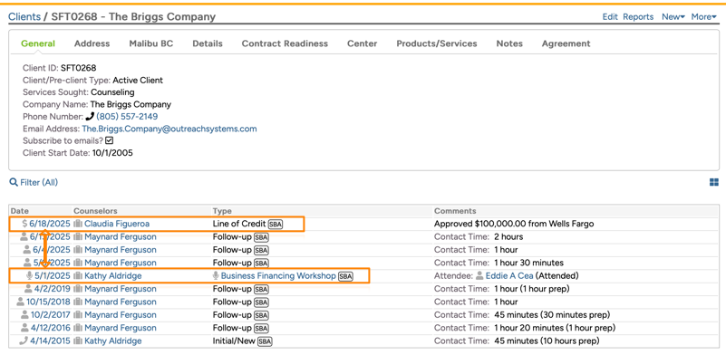 This metric is designed to track the average number of days between a client's first counseling session in the reporting period and the client's Date Company Established. It should be noted, that a client may have had counseling sessions prior to the reporting period, but Neoserra will use the date of the first counseling session in the scorecard definition period. Sessions that took place outside of the reporting period are not taken into consideration. The metric specifically looks at the "Session Date" on the counseling session record and the "Date Company Established" on the client record: