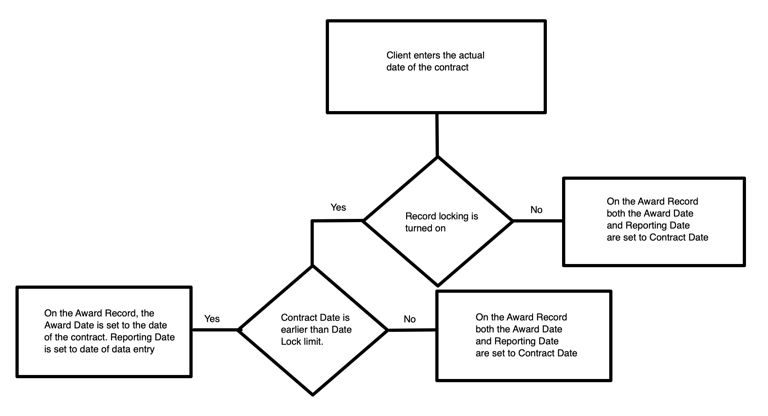 Besides the award record's Contract Date this record type also includes a Reporting Date field, which is the date used for reporting by scorecards. This means that your contract date can be within the locked period, but the reporting date cannot be within the locked period. If the record locking has been engaged then: