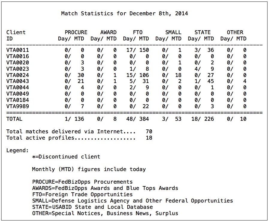 Each data source column is explained in the legend found at the bottom of the report. Keep in mind that the the numbers represent the type of bid leads each of your clients received, these numbers do not represent awards your clients might have won or bid responses they might have submitted. This report enumerates the bid opportunities provided to your clients by Outreach.