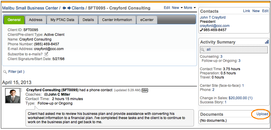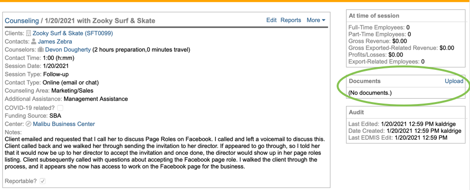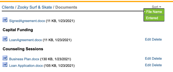 Note for SBDC/WBCs: When you are looking at all documents, then you will see not only those documents uploaded by the users, but you will also see any documents attached to your SBA exports. These documents are shown here for your reference, but keep in mind that they do not impact your storage allocation.