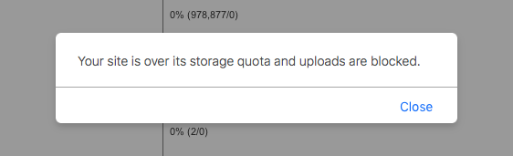 Furthermore, if you are nearing your storage capacity limit, then the all users will see the following warning message when they hover over the "Upload" link: