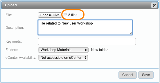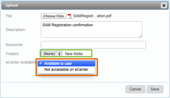 Clicking the Upload button opens a new window where you can browse for the file(s) to upload, enter a description of the file, associate keywords with the file, and make the file available to the user on eCenter Direct, as shown in the next graphic in orange: