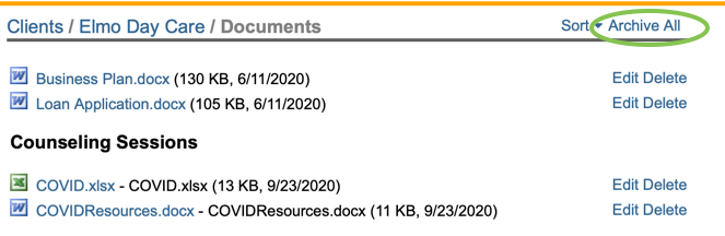 Alternatively, administrators have an option to archive up to 200 documents from the client's document panel. On the client record, click "All document (X)" to see all documents associated with the client record: