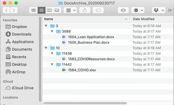 Since the archive file will include documents from different areas in Neoserra and it will include different types of documents, they will be saved off as a .zip file that mimics the internal structure in Neoserra, with each document name including the internal ID to avoid possible duplications in naming convention: