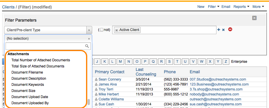 For documents that you attach to client records, all information associated with the upload (document filename, document description, document keywords, document size, document upload date and document uploaded by) can be used in the future as criteria for client filters. Additionally, you can filter for those clients with a certain number of attached documents and/or those clients with a certain size of attached documents: