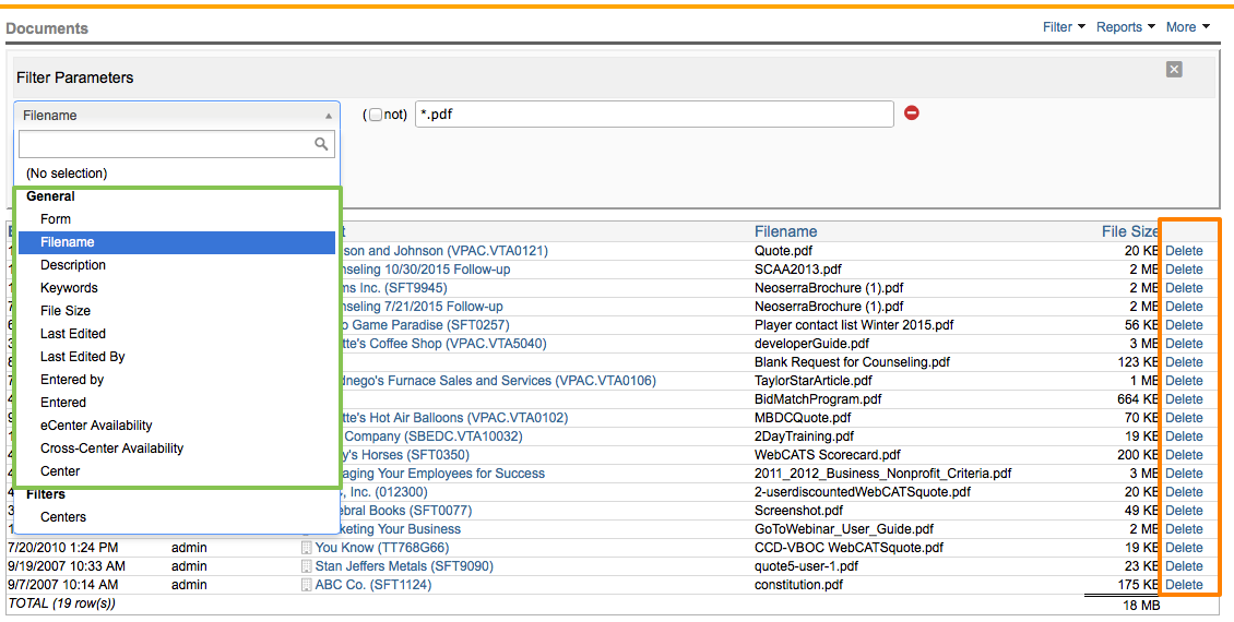 As shown in green, you can create a filter for certain types of documents. In the example above we are looking for all PDF documents in the database. To search for all documents of a certain type, you will want to use the asterisk wildcard followed by the desired extension. In the example above, we are looking for "*.pdf" where the asterisk represents any filename followed by the .pdf extension. If you wanted to search for all documents with the words "financials" then you could search by using the wildcard at the start and end of the phrase. So your filter would contain: "*financials*