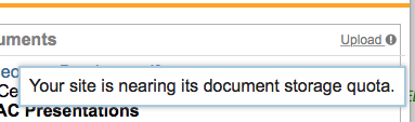 Furthermore, if you are nearing your storage capacity limit, then all users will see the following warning message when they hover over the "Upload" link: