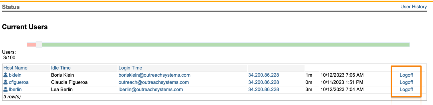 Manual disconnects are necessary when you need to free up a user seat and don't want to wait for the session to time out due to idleness. To manually disconnect a user, enter administrator-mode and select Administration|Status. As shown in the next graphic, the top "Current Users" table shows all users that are currently logged in. To disconnect a user, click the "Logoff" hyperlink that displays in the far right column of the user's table entry. A pop-up window will display, asking if you are sure that you want to disconnect the user. Click OK and the user will be disconnected.