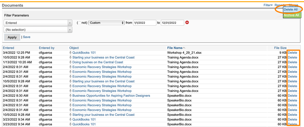 Here you can create a filter for those documents that you might want to consider deleting. For example, documents that are more than three years old; or, documents that are larger than 5MB in size; or, documents with a particular file name, etc. Once you have isolated those documents that you want to delete then you can either individually delete them, or select More|Delete All: