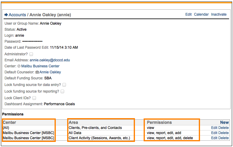 - Edit. Edit permissions allow you to edit all aspects of the records (except for center ownership) associated with the current set of permissions.