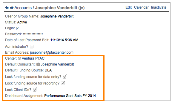 - Default (sub)funding sources. As with the default counselor selection, the funding source and sub-funding source default determines the funding source(s) when creating new records or when clients are initially assigned to the counselor. If no default funding source is selected, then the global default funding source(s) (set under Administration|Configuration|Pick Lists will be used. There are two types of funding source locks that may be in place for your user account: