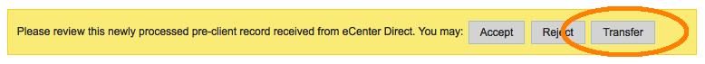 - When processing new eCenter Client Sign-ups Received you only need the "Edit (including Center)" permission setting to that newly received pre-client's center record in order to see the "Transfer" option at the top of the screen: