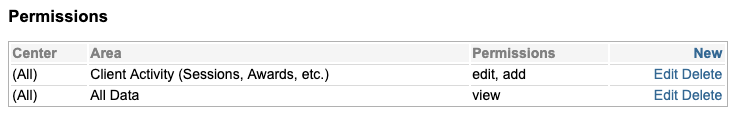 - Client Activity (Sessions, Awards, etc.). This database area indicates that the permission types found in the current set of permissions apply to all client activity records (including custom activity records) of the selected center(s).