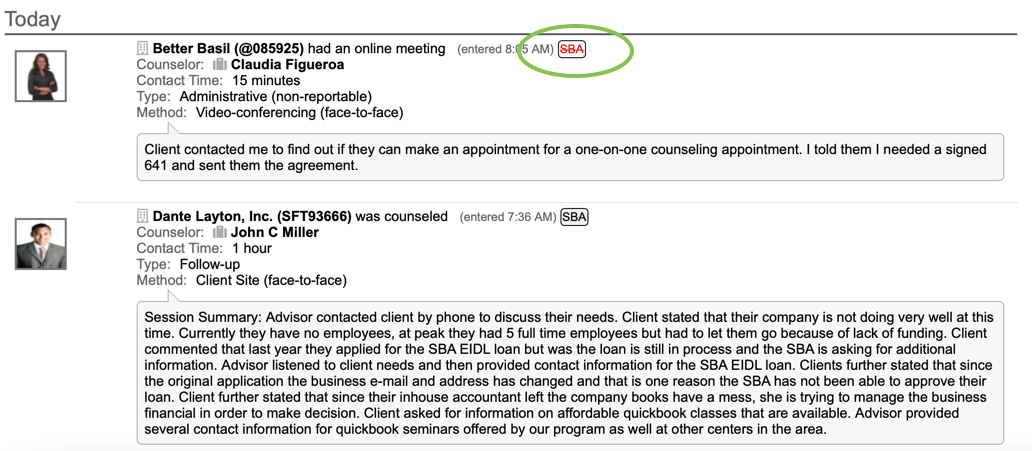 Any sessions entered into Neoserra for pre-clients will automatically be marked as non-reportable, meaning these sessions will not show up on your scorecards or in your SBA exports. Non-reportable counseling sessions are identified in the Neoserra data stream with a strike through the funding source, and the funding source identifier is also shown in red: