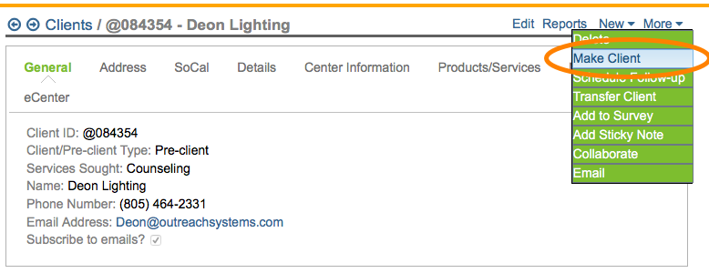 When one of your pre-clients completes the steps to become a client, then you can convert them to client status. Navigate to the pre-client record and select More|Make Client: