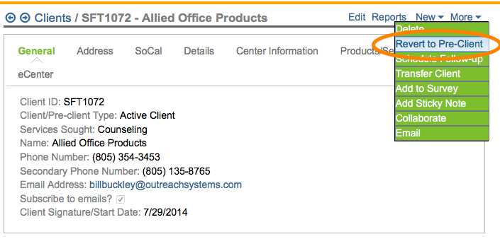 To convert an existing client to pre-client status, you can click on the More|Revert to Pre-client menu option, but only if you are in administrator mode: